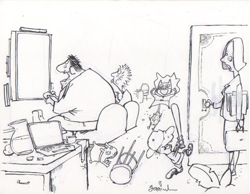 | Cada día hay más mujeres que son la entrada principal de dinero en un hogar, dice un estudio. Final art here en El Nuevo Herald: http://www.elnuevoherald.com/2013/05/30/1488207/viernes-31-de-mayo-de-2013.html Final art, English version: http://www.cartoonistgroup.com/store/add.php?iid=97752 |